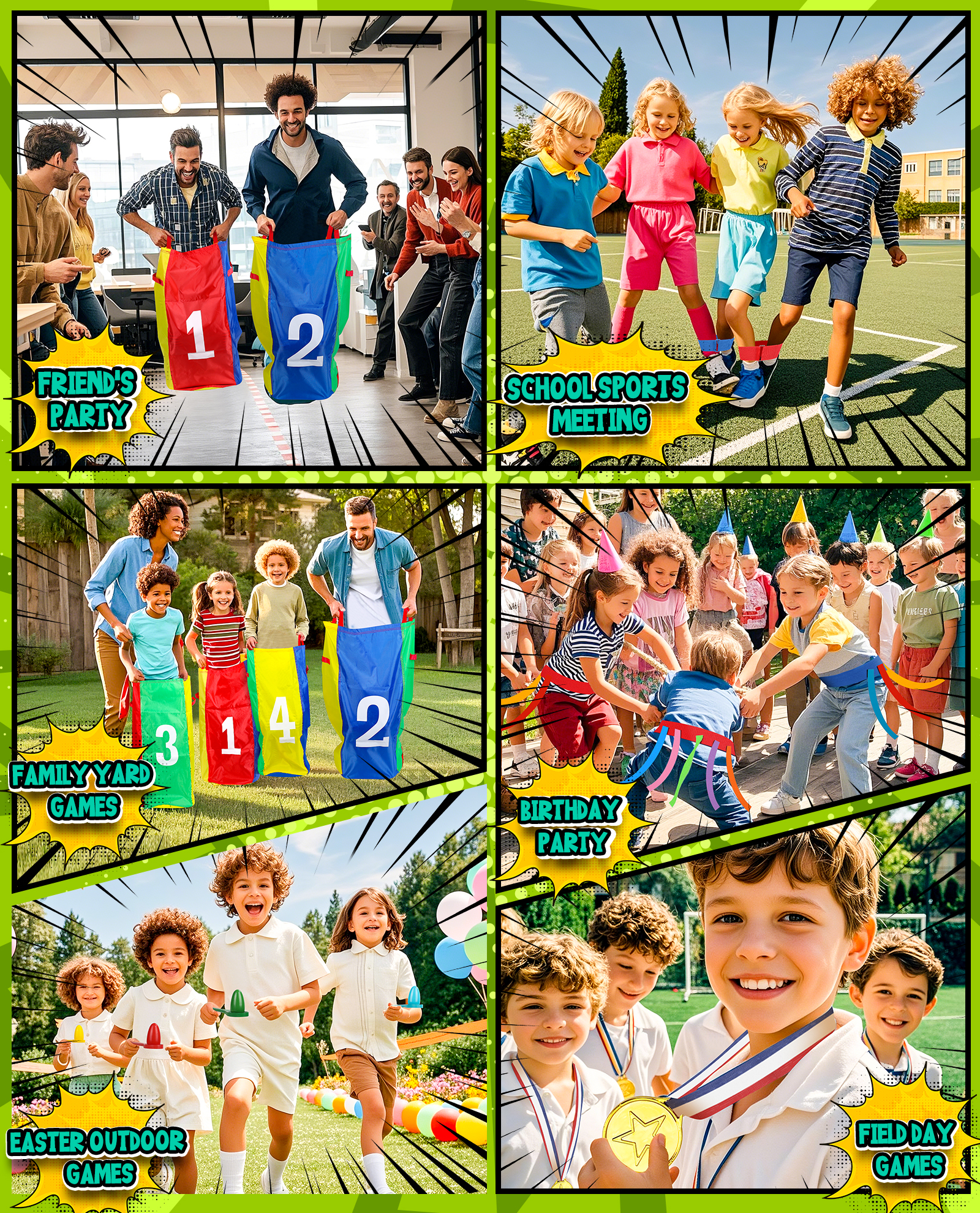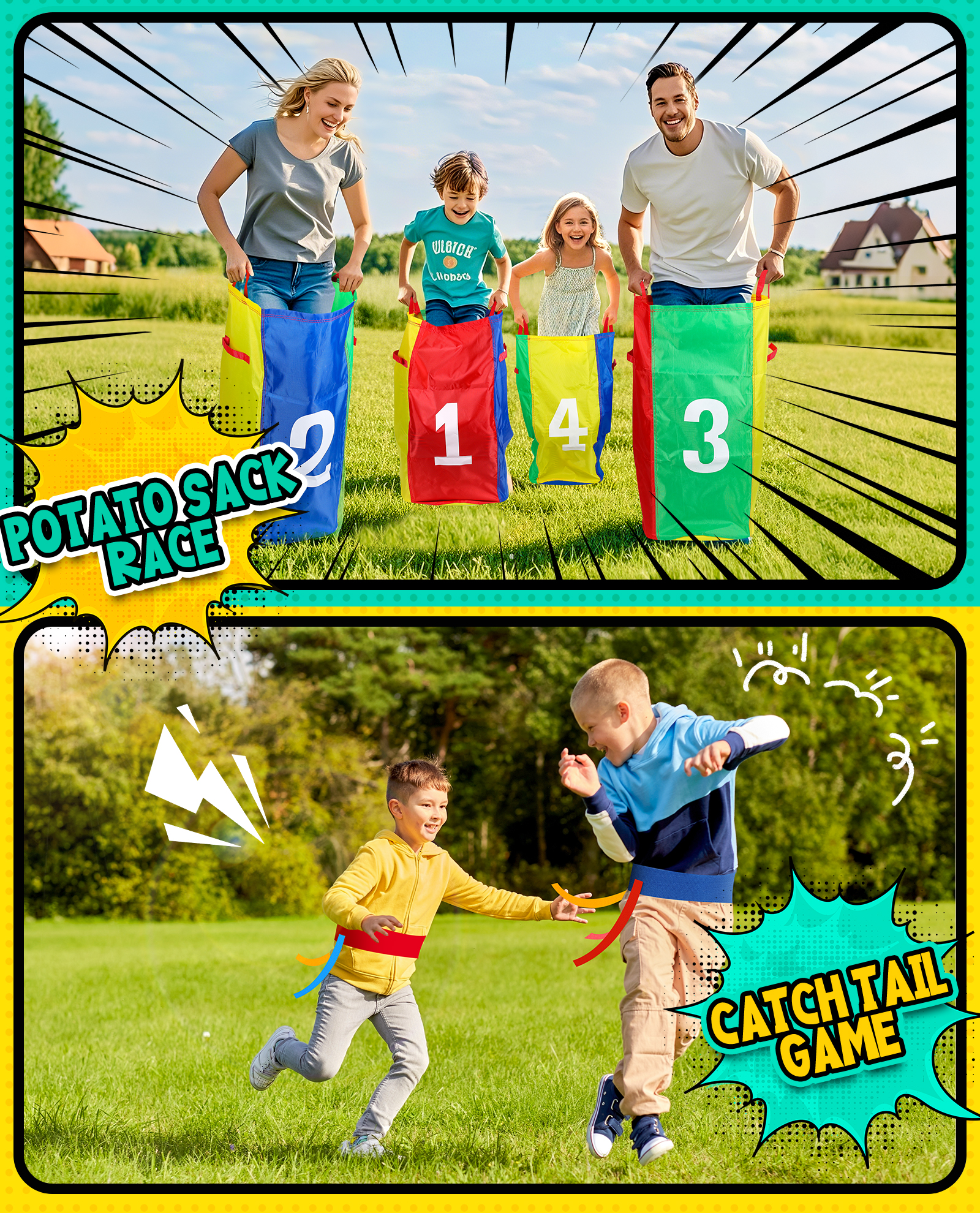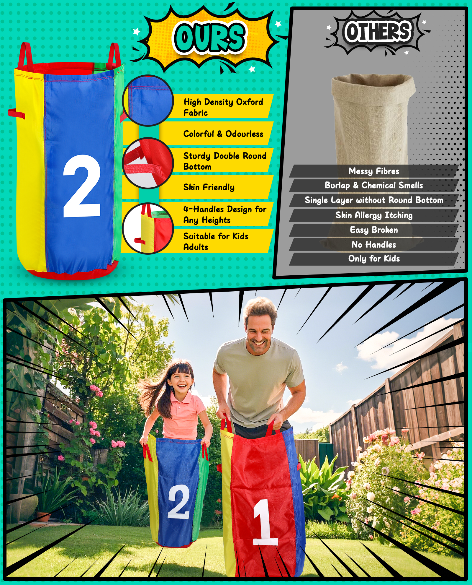 Upgraded Potato Sack Race Bags: The sack race bags are made of upgraded high-quality durable Oxford Fabric with fine stitch sewing, 4pcs birght colorful Potato Sack Race Bags suitable for kids and adults, size 34" x 17", big and large enough for adults, we also specially make two carry handles for liitle kids, kids can play with it easily, then you do not have to buy extra smaller size bags for childrens, whcih can save some money